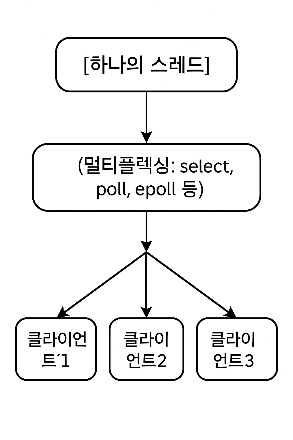 멀티플렉싱(multiplexing)은 하나의 스레드가 여러 클라이언트의 연결을 동시에 감시하고, 이벤트가 발생한 연결에만 반응하여 처리하는 방식입니다.